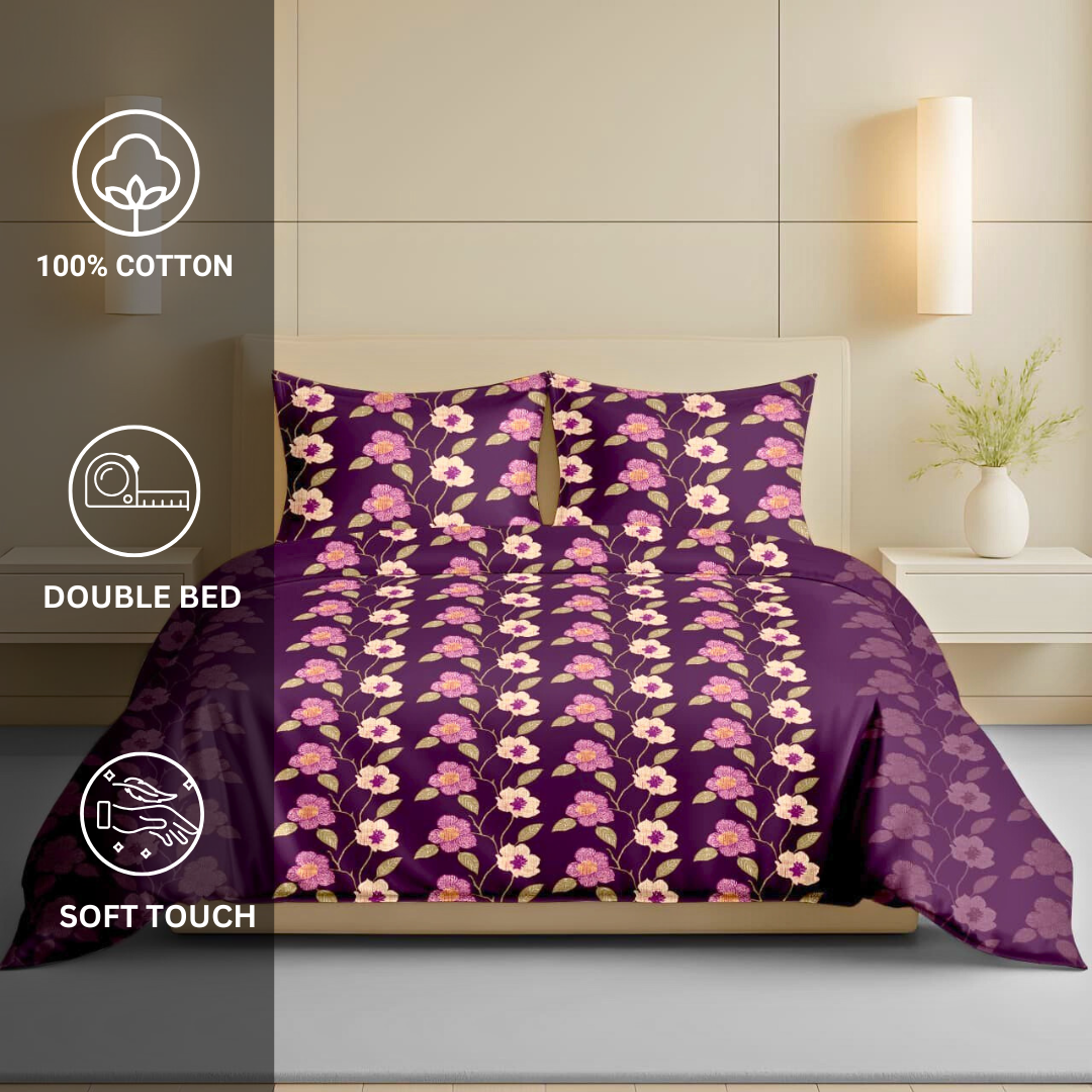 100% Cotton Double bedsheet with 2 pillow covers – Purple Florals