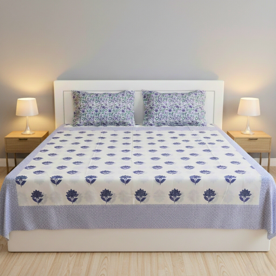 100% Cotton Parkle King bedsheet with 2 pillow covers - Indigo Bloom100% Cotton Parkle King bedsheet with 2 pillow covers – Indigo Bloom
