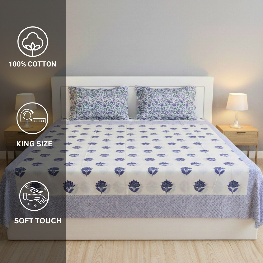 100% Cotton Parkle King bedsheet with 2 pillow covers – Indigo Bloom