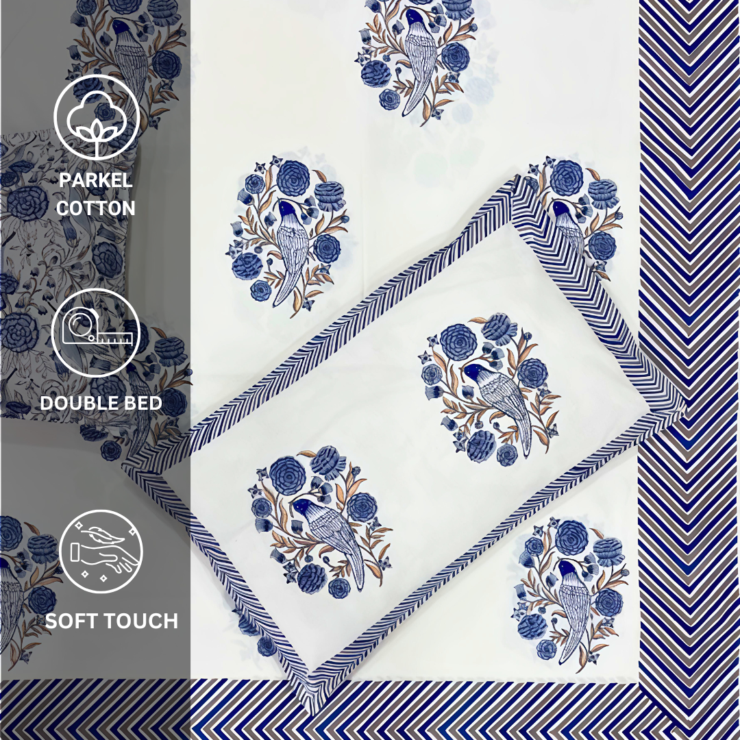 Jaipuri Hand block print Parkel Cotton double Bedsheet – Blue Cuckoo